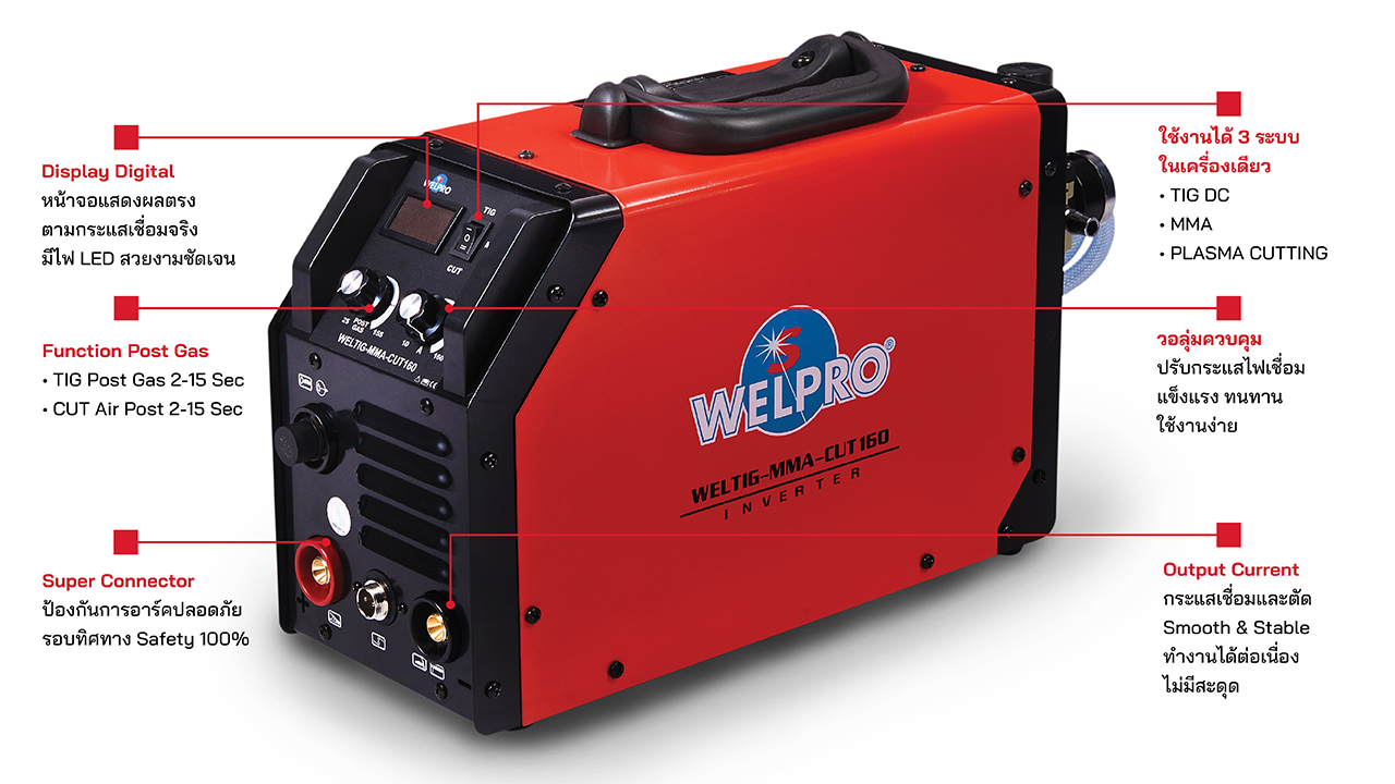 กระแสเชื่อมและตัด TIG (DC) 10-160A / MMA 10-160A / CUT 15-40A ตรงตาม Display แสดงผลกระแสตรงจริง ให้การปรับเป็นเรื่องง่าย