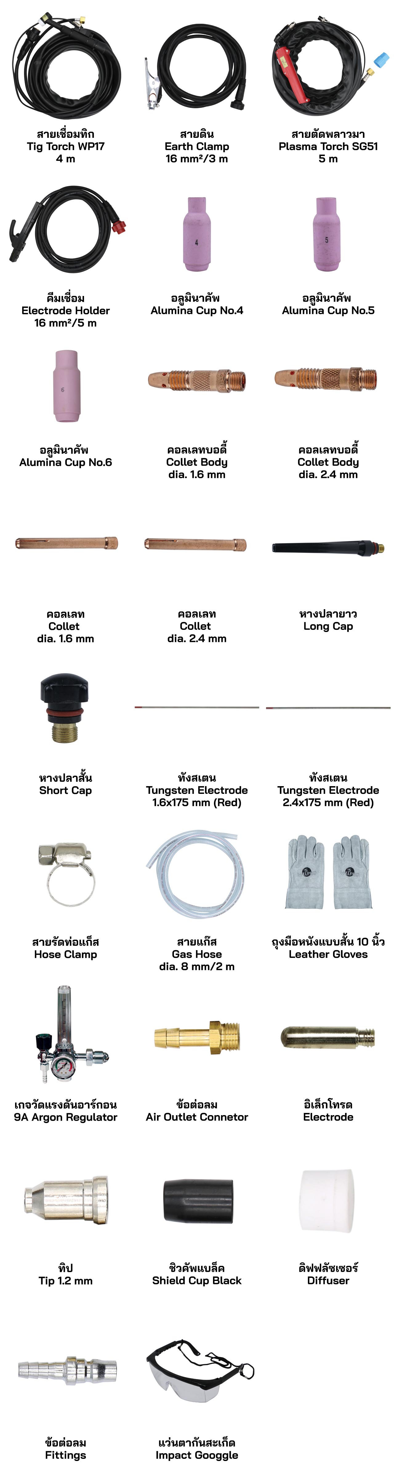 ตัวเครื่องสามารถใช้งานได้ทั้ง TIG DC MMA และ PLASMA CUT ในเครื่องเดียวกันครอบคลุมทุกการใช้งาน